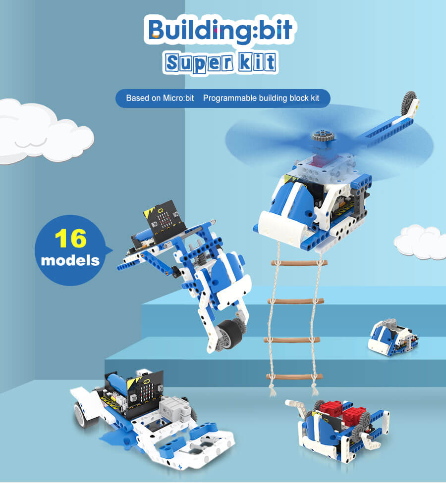 16-in-1 super kit programmable building block kit is designed based on BBC Micro: bit, which is composed of Super: bit expansion board, building block servo, Building block motor, battery and 358 building block parts.