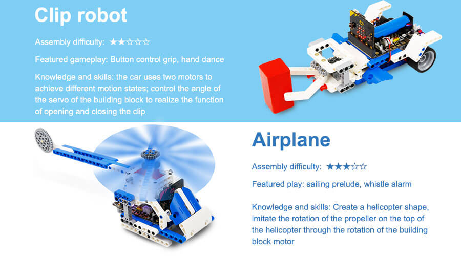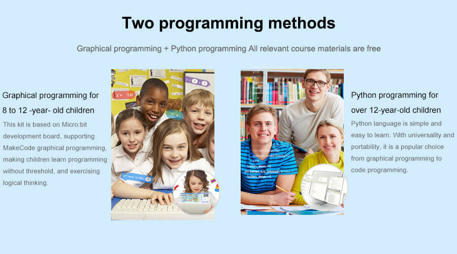 - MakeCode programming + Python programming, suitable for users of different ages.