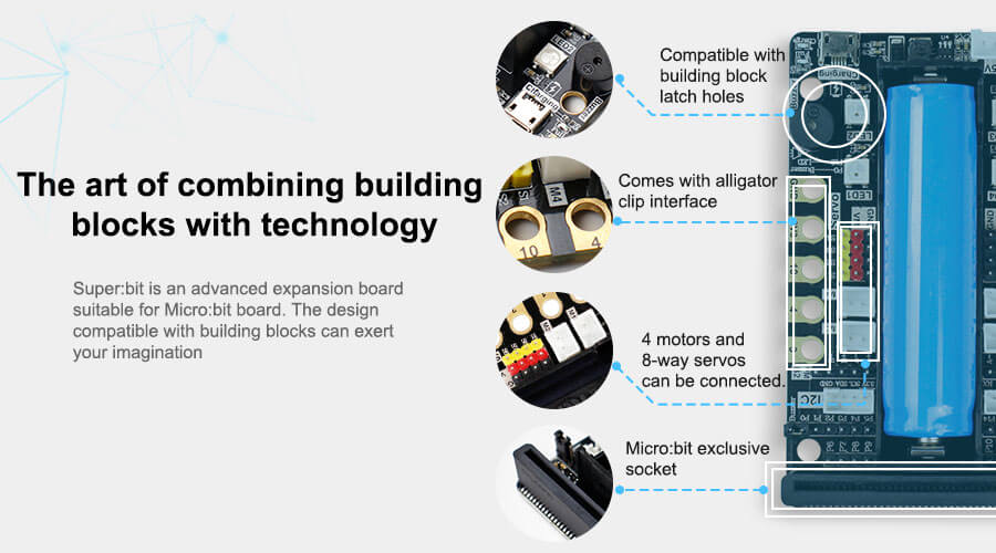 Super:bit expansion board specially designed for Micro:bit can perfectly integrate with building blocks, build any shape, and drive building block servo, motor, RGB lights and other devices.