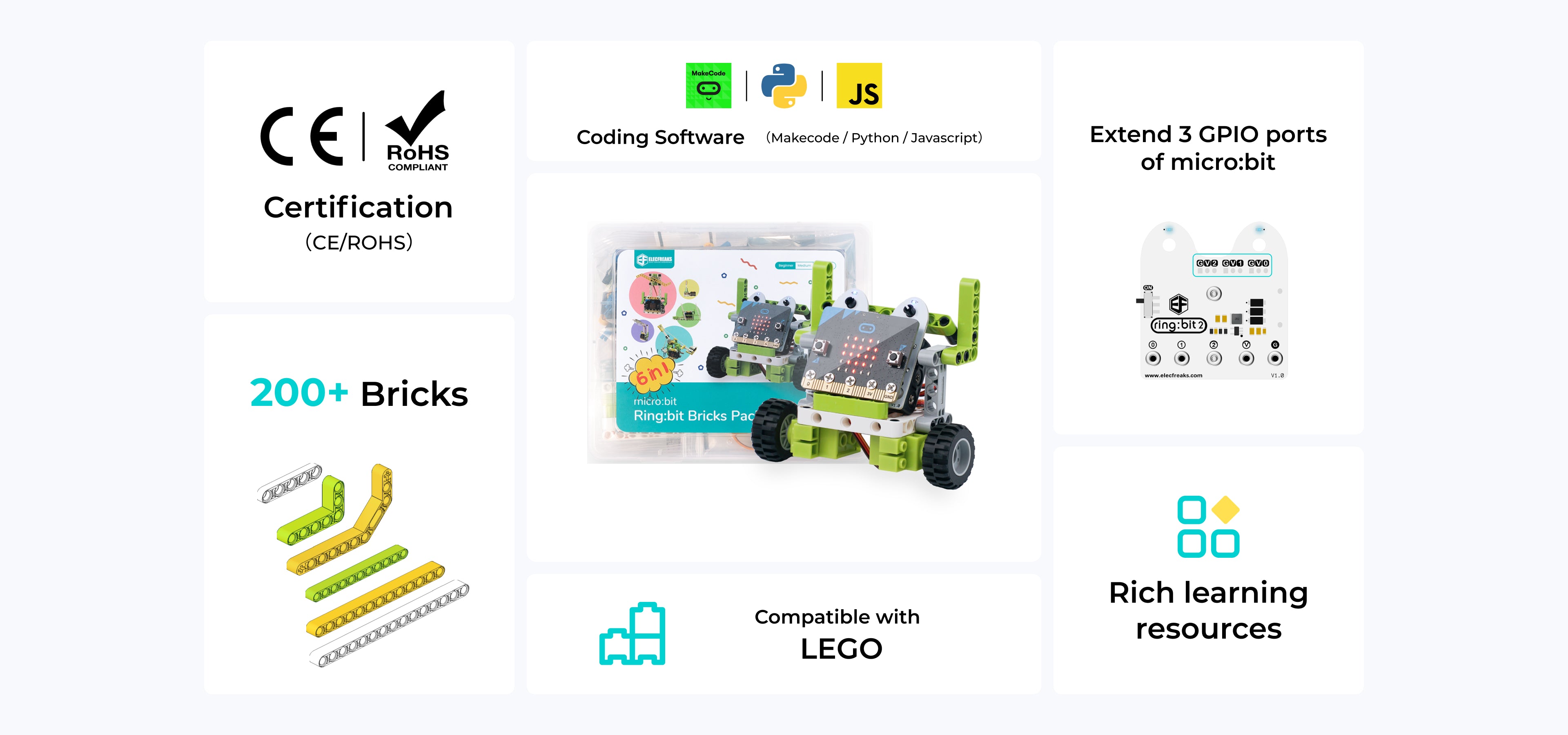 Based on the Ring:bit V2 from Elecfreaks, the micro:bit 6 IN 1 Ring:bit Kit contains 360 degrees servos, the LED strips and almost 200 pieces bricks. Together with the well-designed assembly instructions and courses, it makes the kids learn the coding easily as well as how to build blocks in an interesting way. Let's start building our kits with the tips!
