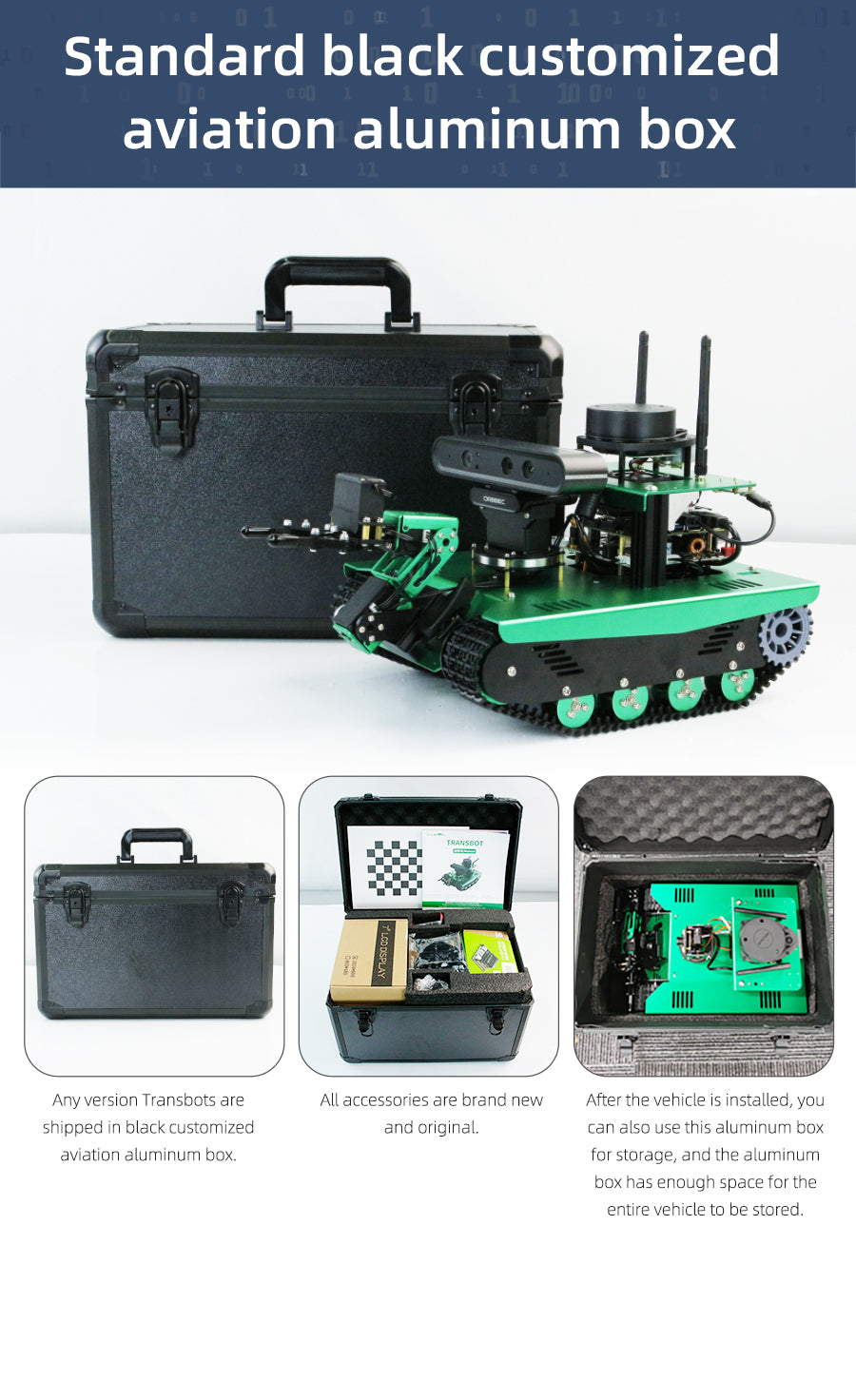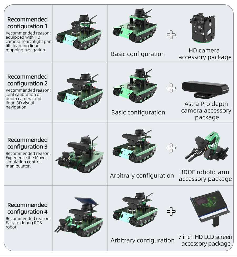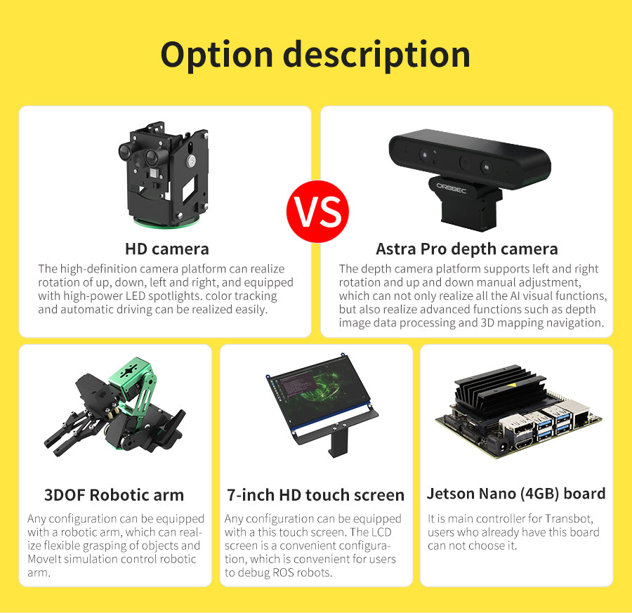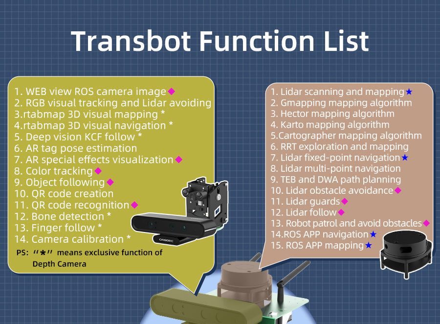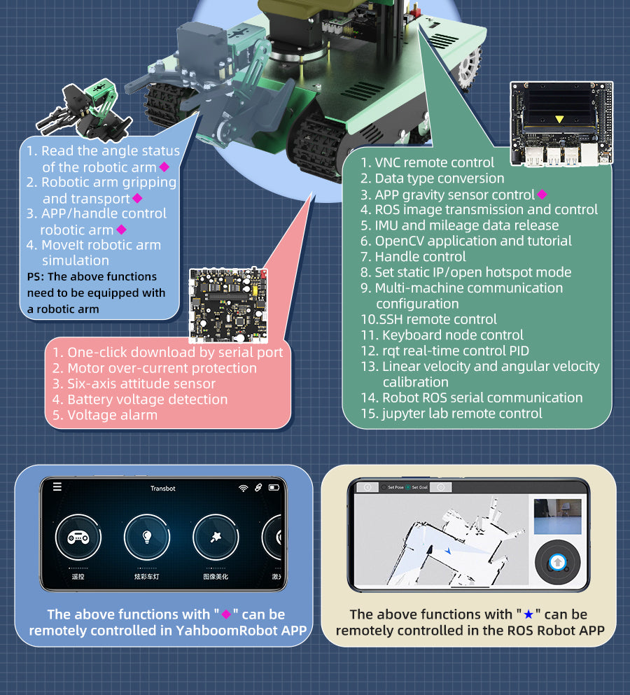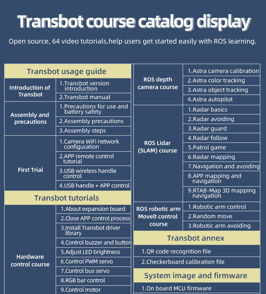 Transbot is a crawler off-road robot based on ROS(robot operating system), which is designed for ROS enthusiasts and robot players. It is equipped with high-performance hardware configurations such as NVIDIA Jetson NANO, Lidar, HD camera/depth camera, etc., which can realize applications such as robot motion control, remote communication, mapping navigation, following-avoiding, autopilot and robotic arm MoveIt simulation. A lot of teaching course documents and videos to help you get started with ROS easily.