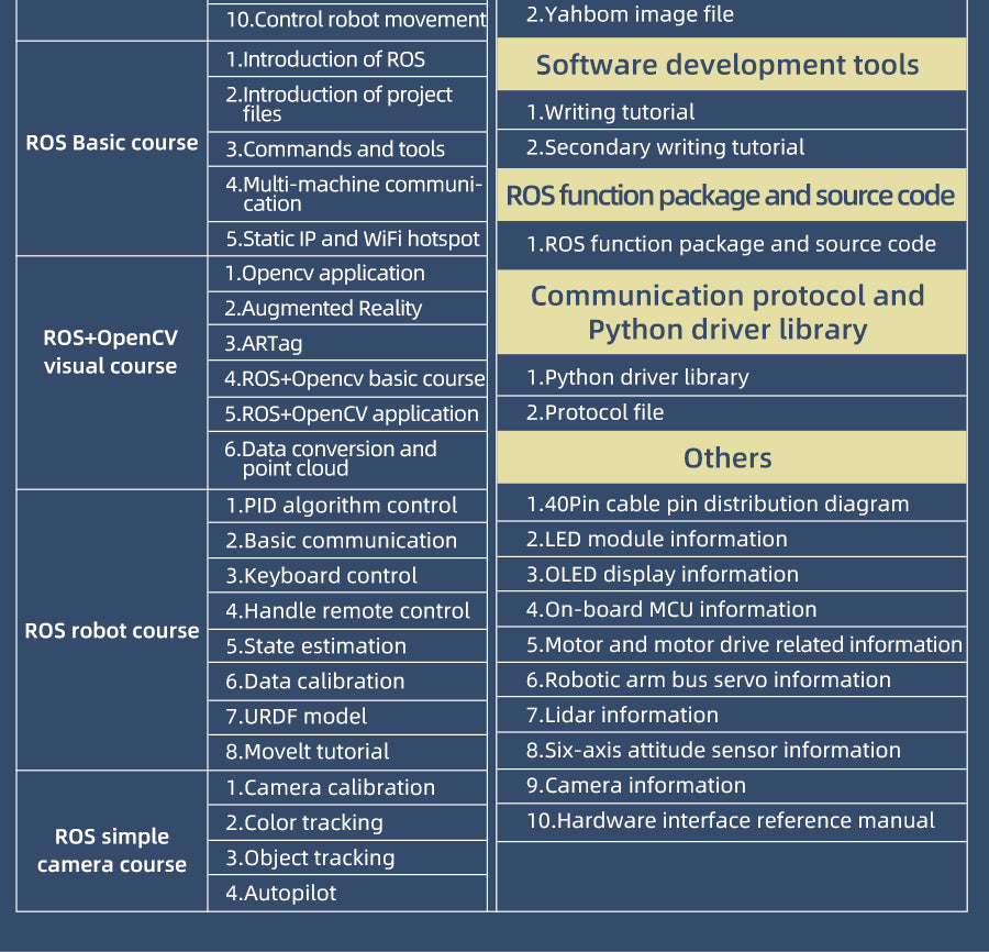 Lidar avoiding, fixed-point navigation, bone detection, finger following, camera calibration, 3D visual mapping navigation, etc.