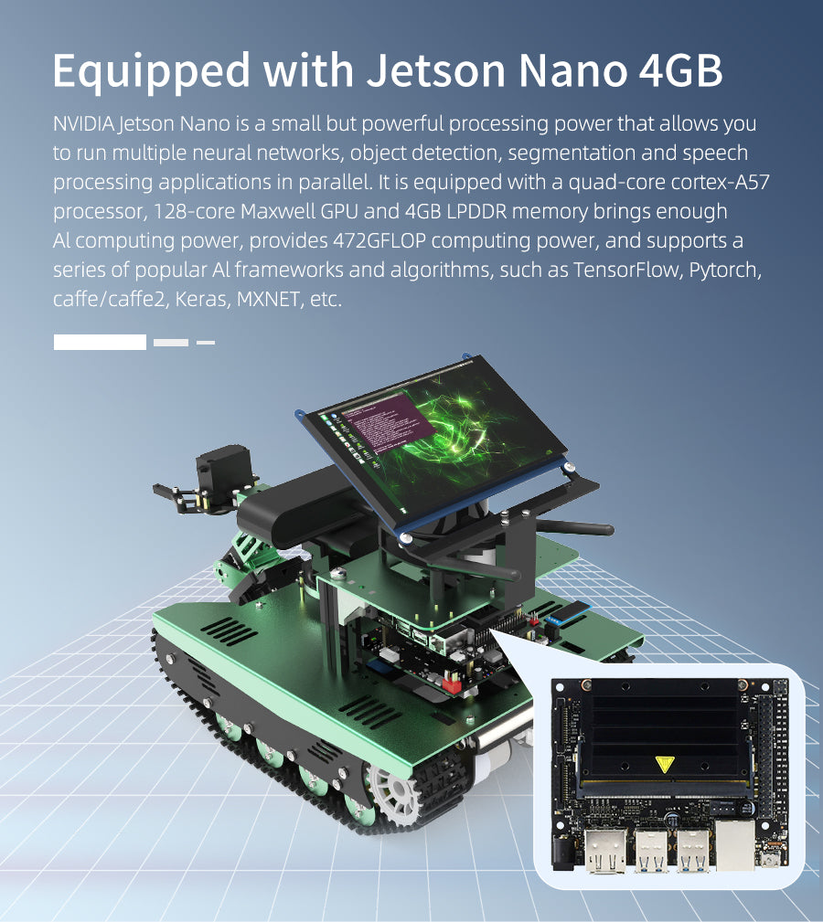 The whole car is made of green aluminum alloy oxide material, supports install robotic arm, 2DOF camera pan/tilt, 7-inch screen and so on. Users can debug the car anytime and anywhere.