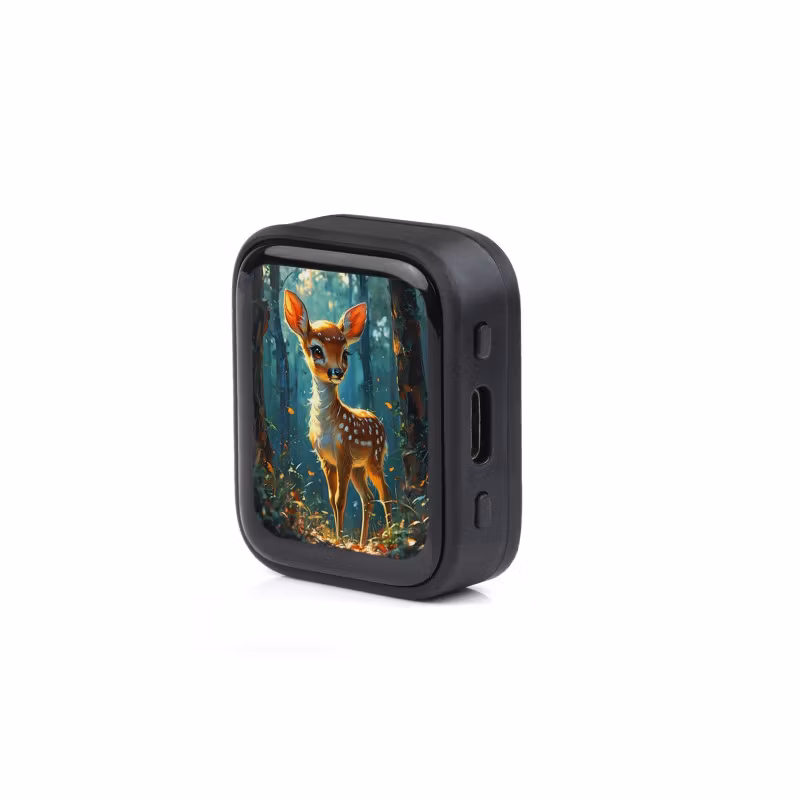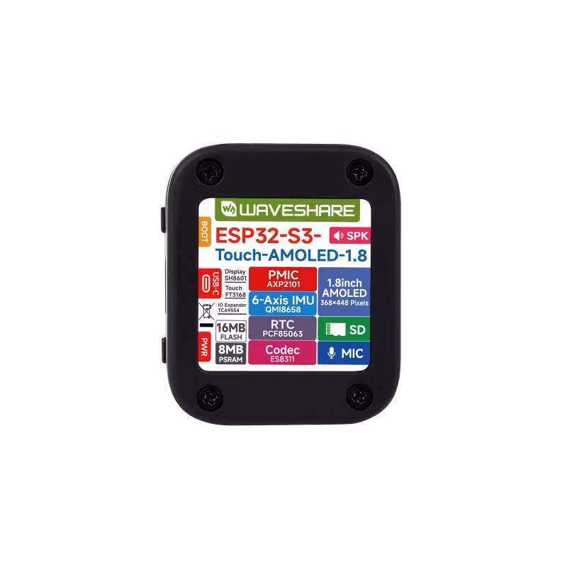 ESP32-S3 development board with 1.8" AMOLED touch display, dual-core LX7 processor, 368×448 resolution, Wi-Fi, Bluetooth, accelerometer and gyroscope (IMU). Ide